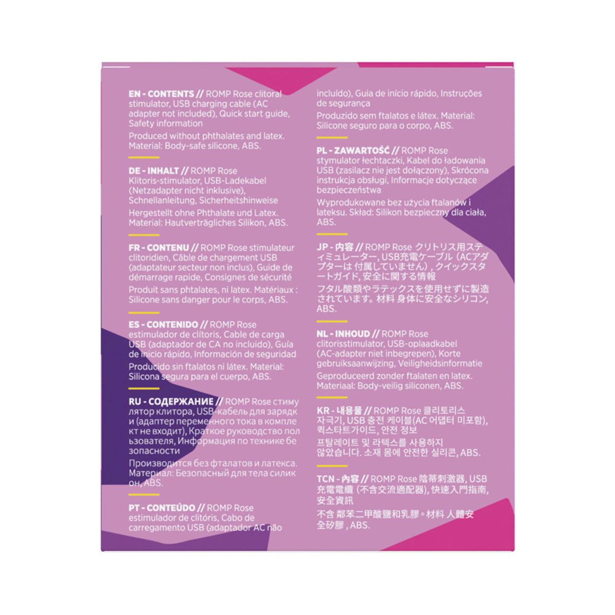 • Packaging contains: ROMP Rose 2.0, USB charging cable (AC adapter not included), Quick Start Guide, Safety Information, and Sticker Sheet