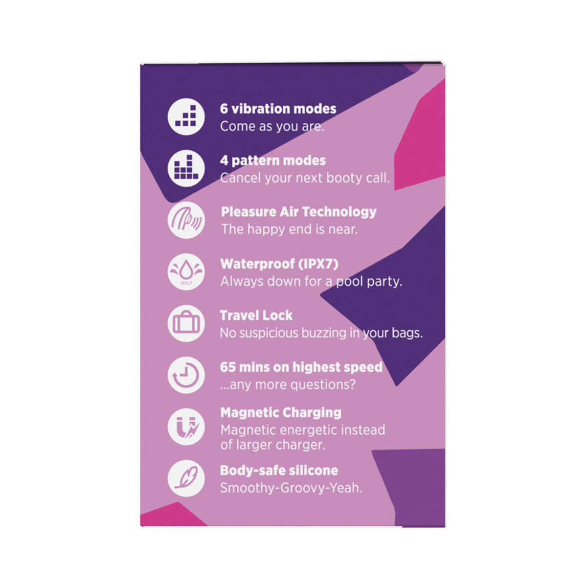 Pleasure Air Technology features the perfect balance between pulsating and massaging changes in air pressure without direct contact to the clit. This ensures that its approx. 8,000 nerve endings are never over-stimulated leading you to a new kind of extraordinary orgasm.